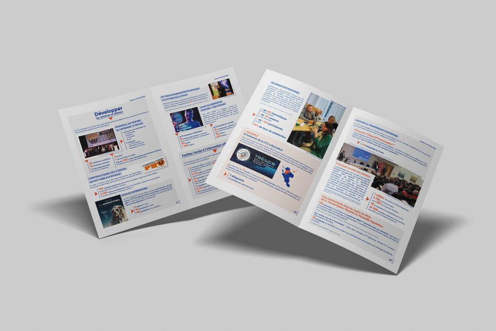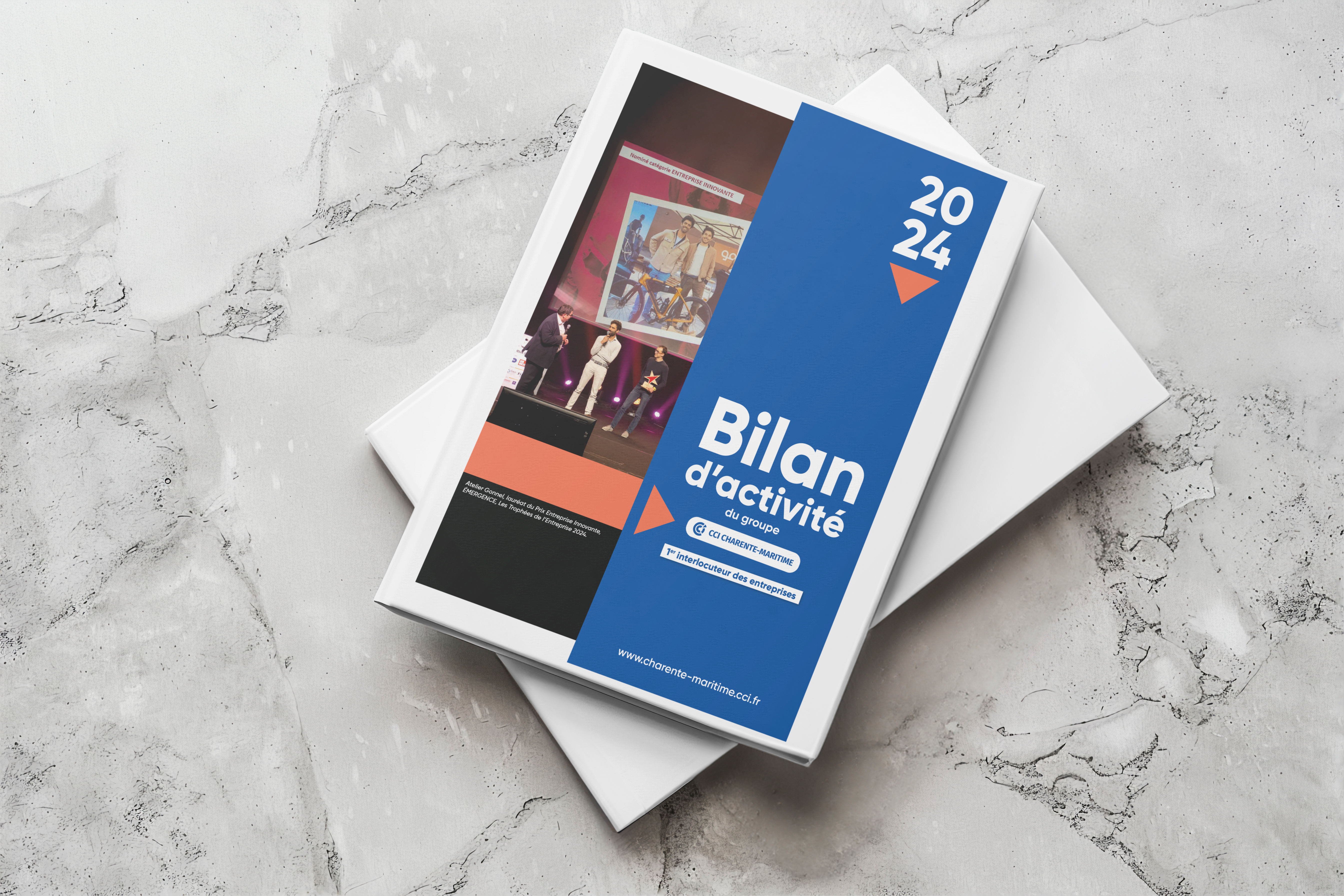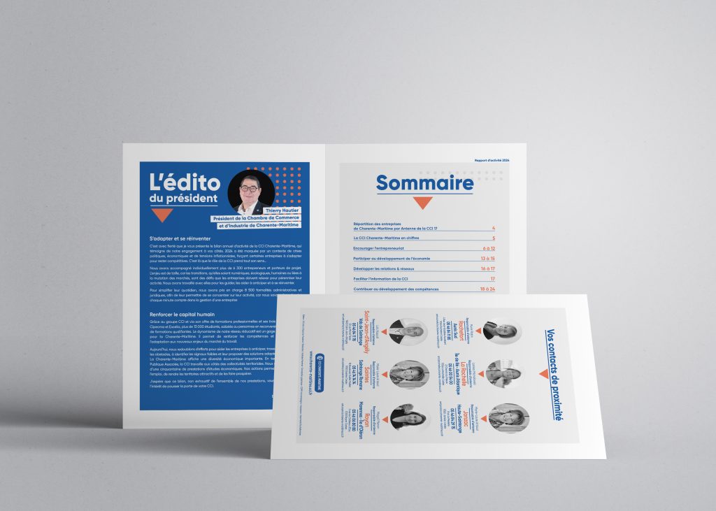 Mise en page du bilan d’activité pour la CCI Charente-Maritime. Contenu rédactionnel réalisé par Nathalie Martinez de la CCI Charente-Maritime.